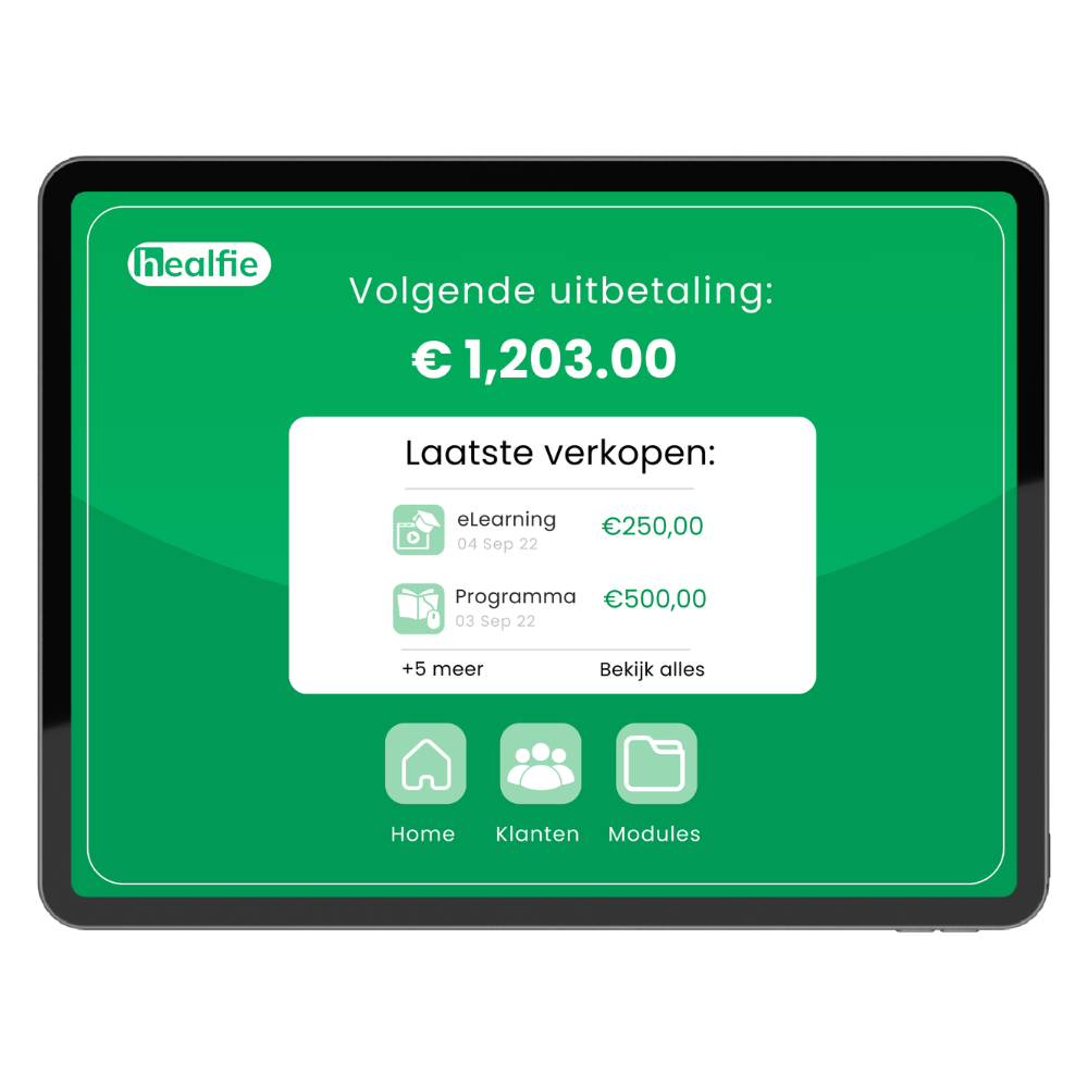 Healfie werkt met een coöperatief model van gedeelde inkomsten, waarbij je pas betaalt wanneer je verdient. Zodra je een programma verkoopt, ontvang je jouw opbrengsten direct van Healfie, met een transparante 10% bijdrage op de opbrengsten. Geen hoge instapkosten of investeringen vooraf. Met slechts één factuur per uitbetaling ben je minder tijd kwijt aan administratie en kun je je focussen op wat echt belangrijk is: het helpen van jouw cliënten.